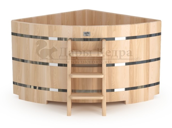 Это треугольная емкость для воды из кедра. Она предназначена для отдыха и охлаждения тела после банных процедур. Купель устанавливается в угол помещения, что идеально для не больших пространств. Так же подходит для уличного использования. Угловая купель оснащена лавочками, приставной и внутренней лестницей из кедра. За счет стяжных болтов обручи из нержавеющей стали плотно прилегают к кедровой купели. Это позволяет равномерно распределять нагрузку воды и сохранить форму изделия в период эксплуатации. При правильном уходе угловая купель для бани не рассыхается и не подвергается гниению.