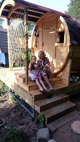 Здравствуйте! Давно собиралась написать отзыв и послать фотографии, но все как то руки не доходили. Сначала хочу сказать огромное спасибо всему коллективу Дары Кедра и отдельно Виктории, с которой мы постоянно общались по телефону. Все наши пожелания были учтены, все было корректно, оперативно и информативно. Мы конечно же, нервничали, не обманут ли, доедет ли, а вдруг не понравится, вдруг это только на фотографиях так красиво и интересно... И вообще, такая необычная баня, не будет ли там темно и страшно... Ох, сколько было сомнений и вот она приехала... Собрали сами, за 3 дня - очень хотелось посмотреть, что же это такое... Два дня мужу помогали друзья. Доделывал уже потом один. В процессе оказались 2 доски треснутые, пришлось склеивать. Больше никаких проблем не появилось. Инструкция понятная, никаких вопросов не возникло. Покрыли дополнительно мойку пропиткой. И вот - тадам! - готово! Можно топить и пользоваться! Ну что сказать - это просто чудо! Реальность превзошла все ожидания ))) А какой запах! Она так пахла, что все соседи удивлялись, какой необычный аромат! Внутри светло, уютно, для 4-х человек - идеально, места всем хватает. Муж поставил дополнительные лампочки в каждом помещении, поэтому света предостаточно. Установили водогрей за дверью в раздевалке. Хотя бака с горячей водой, который нагревается в парилке, достаточно. Просто голову помыть проточной горячей водой, более комфортно...Очень удобно оказалась печка с загрузкой на улице, - в бане нет мусора, нет дыма. Да прогуляться, проверить или подложить дров-после парилки - только в удовольствие. Топили каждый день, почти все лето. Такое вот у нас появилось развлечение на даче - каждый вечер в бане, и дети, и родители, и гости - все там. Уже с утра начинаются разговоры, во сколько пойдем вечером в баню...Греется она быстро, через час неспешной топки, уже можно идти парится. Родители дожидались, когда баня остынет до 60-50 градусов. В общем, довольны все! Спасибо огромное! Это потрясающее чудо и волшебство! Пожалели, что не заказали навес над входом. Доделывали уже сами. И не хватает ступенечек, порог высоковат. Тоже достроили. Но все это такие мелочи, по сравнению с самой баней! Она великолепна! И круглая форма придает ей такую необычность и изюминку.... В общем спасибо, мы всем рекомендуем вашу фирму и ваши бани! А сами мечтаем теперь о купели с холодной водой - поставить рядом и нырять после парной )))). Может быть закажем на следующие год. Спасибо еще раз за это чудо!